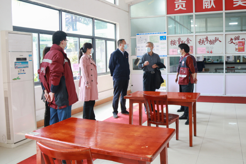 調研中,胡忠凱檢查了廠區各項防疫措施落實情況,其中重點查看了公司食堂衛生、就餐環境、餐具消毒、人員健康防護及防疫宣傳氛圍布置等情況。許鵬介紹了公司車間、食堂、辦公樓等重點區域疫情防控的安排和措施。