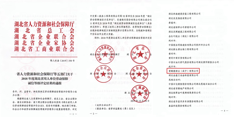 近日,經(jīng)湖北省人力資源和社會保障廳等五部門評定,黃鶴樓酒業(yè)(咸寧)有限公司被授予“2018年度湖北省用人單位勞動保障誠信示范單位”稱號。