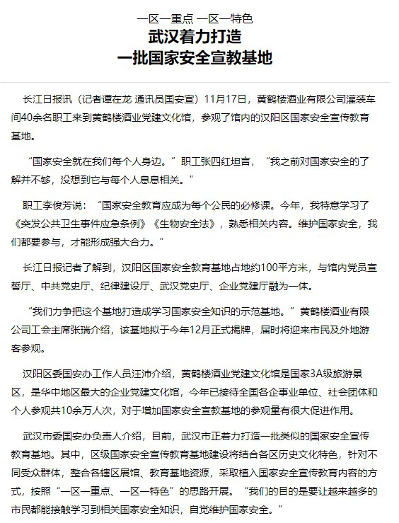 ? ? ? ?據了解,早前,為更好地宣導國家安全知識,鼓勵市民自覺維護國家安全,國安辦選定黃鶴樓酒業黨建文化館,打造漢陽區國家安全宣傳教育基地,并高度重視此基地的建設工作。長江日報在獲知此消息后,11月17日,教育基地完成基礎建設后,同武漢市國安辦一行一起前往黃鶴樓酒業,了解基地建設成效,并對此進行宣傳報道。