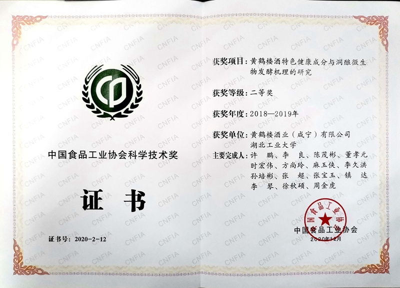 黃鶴樓酒業中國食品工業協會科學技術獎二等獎