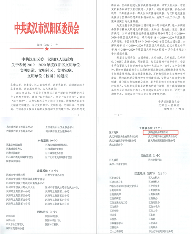 新年伊始喜訊傳,1月21日黃鶴樓酒業被中共武漢市漢陽區委員會授予“2019-2020年度區級文明單位”榮譽稱號。