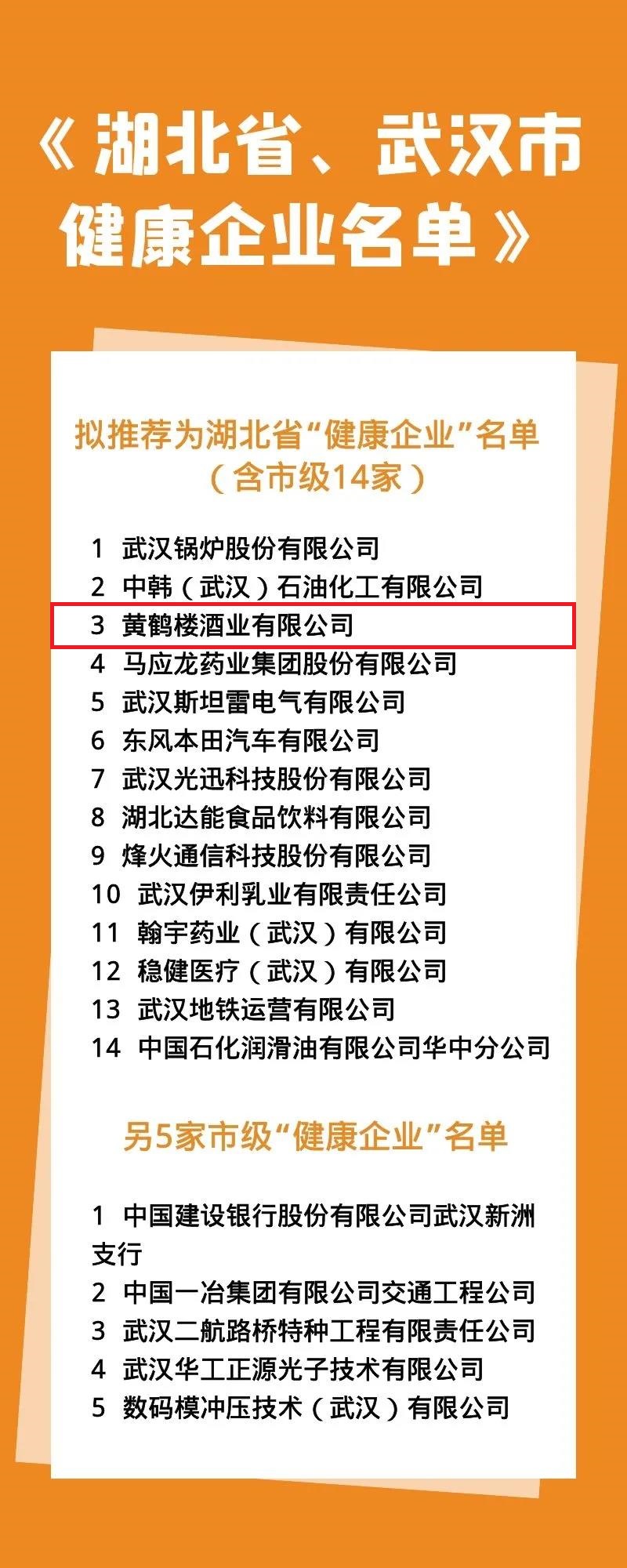 近日,2020年武漢市“健康企業(yè)”創(chuàng)建和評審結果揭曉。黃鶴樓酒業(yè)獲評市級“健康企業(yè)”榮譽,并將被推薦參評湖北省“健康企業(yè)”。