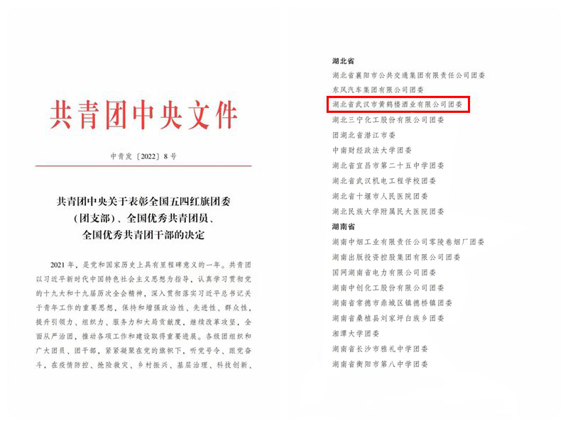 2022年是中國(guó)共青團(tuán)成立100周年。近日,共青團(tuán)中央作出表彰決定,頒發(fā)全國(guó)五四紅旗團(tuán)委、全國(guó)五四紅旗團(tuán)支部、全國(guó)優(yōu)秀共青團(tuán)員、全國(guó)優(yōu)秀共青團(tuán)干部等榮譽(yù)稱號(hào)。其中,共青團(tuán)黃鶴樓酒業(yè)有限公司委員會(huì)獲評(píng)全國(guó)五四紅旗團(tuán)委稱號(hào)。