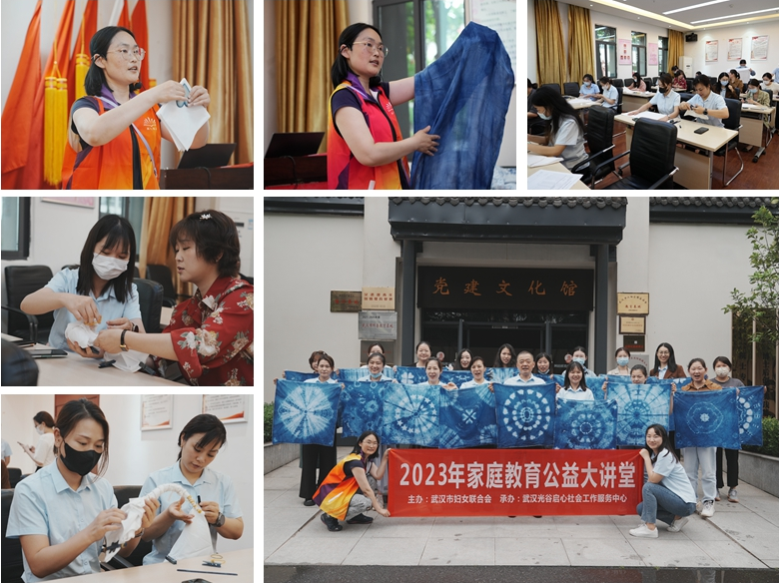 本次活動邀請武漢光谷啟心社會工作服務(wù)中心老師進(jìn)行指導(dǎo)。活動開始,老師向大家介紹了扎染的歷史與傳承,隨后老師現(xiàn)場演示幾種扎染花紋的扎節(jié)方式以及操作技巧,扎節(jié)時松、緊、疏、密的不同,使得扎染成品花色圖案千差萬別,絢麗多姿。隨后,參會人員紛紛發(fā)揮著自己的想象力創(chuàng)造力,扎染出屬于自己獨(dú)一無二的花紋。