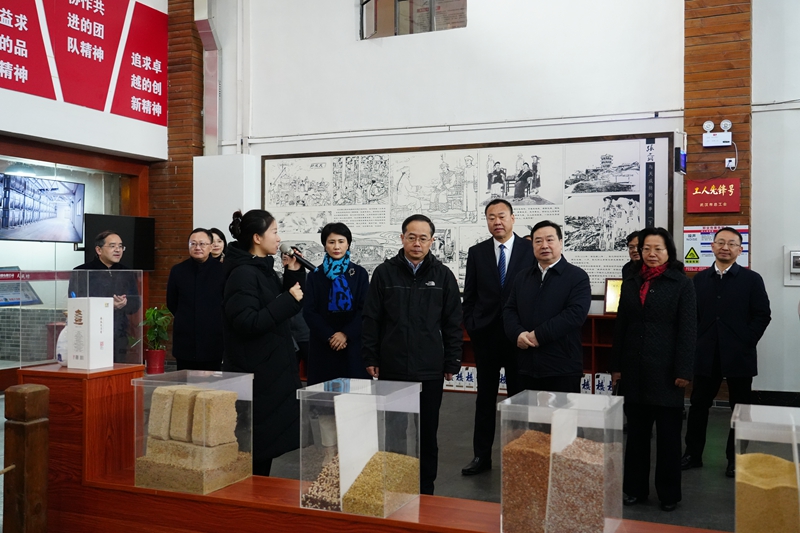 在天成坊釀造車間,吳朝安一行了解了黃鶴樓酒的釀造生產(chǎn)工藝,許鵬匯報了黃鶴樓酒的歷史文化與企業(yè)發(fā)展近況。他表示,近年來,黃鶴樓酒業(yè)高度重視產(chǎn)品升級與匠心釀造,希望市委市政府加大幫扶力度,助力中國名酒復(fù)興,助推武漢禮物發(fā)展。吳朝安表示,黃鶴樓酒作為湖北唯一中國名酒,要加深品牌宣傳工作,加實產(chǎn)品推廣力度,激發(fā)企業(yè)發(fā)展?jié)撃?要堅持產(chǎn)品特色,立足資源優(yōu)勢,打造更優(yōu)產(chǎn)品,打響武漢名片。