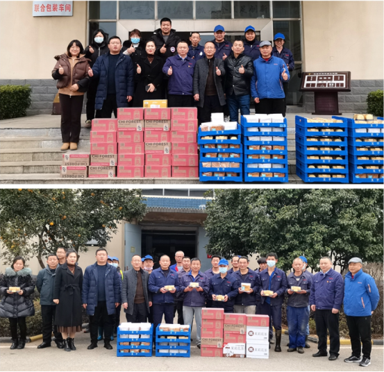 謝毅一行來到釀造車間、包裝車間、勾儲車間、儲運部、后勤組等一線部門,向奮戰在工作崗位上的員工表達親切問候,并為他們送去面包、蛋糕、飲料等溫暖物資,勉勵他們站好節前最后一班崗,為公司的春節沖量做好“保障兵”。