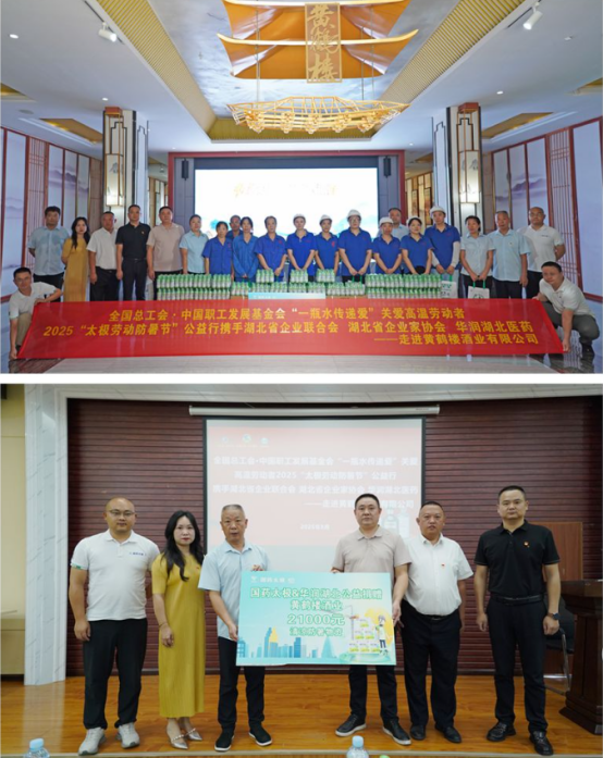 捐贈儀式上,國藥太極和華潤湖北醫藥向黃鶴樓酒業一線員工捐贈了價值21000元的防暑物資,并叮囑一線員工在工作中注意夏日健康防暑。