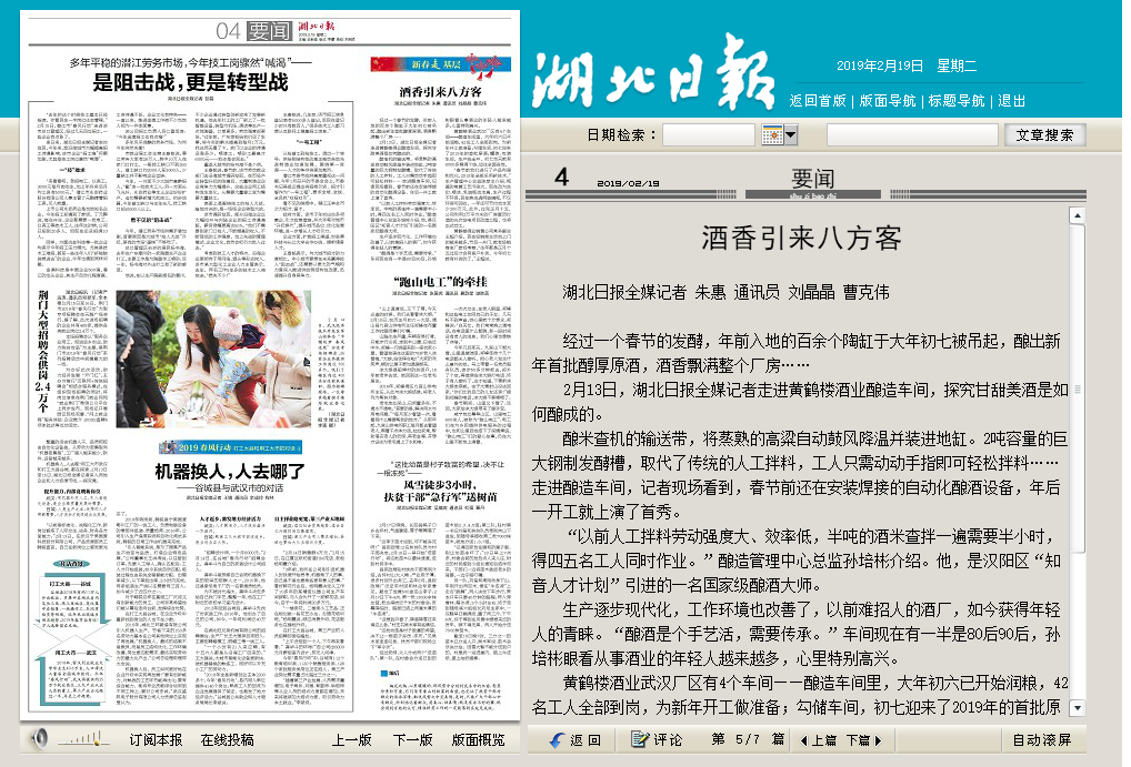 黃鶴樓酒業(yè)武漢廠區(qū)有4個車間——釀造車間里,大年初六已開始潤糧,42名工人全部到崗,為新年開工做準備;勾儲車間,初七迎來了2019年的首批原酒;罐裝、包裝車間,生產(chǎn)線全開,初七當天就有8000多箱酒下線,運往全國各地。“春節(jié)前我們進行了產(chǎn)品布局和優(yōu)化,2019年全部采用新技術(shù)。”生產(chǎn)管理中心總監(jiān)陳彥龍介紹,瓶蓋的電鍍工藝污染大,現(xiàn)在改為絲印、噴涂,乳玻瓶成本高、生產(chǎn)過程不環(huán)保,現(xiàn)在換成透明玻璃瓶,不僅環(huán)保可回收,一年還可節(jié)約成本至少300萬元。此外,過完正月十五,公司利用2萬平方米的廠房屋頂打造的光伏發(fā)電項目改造工程,也將正式動工。