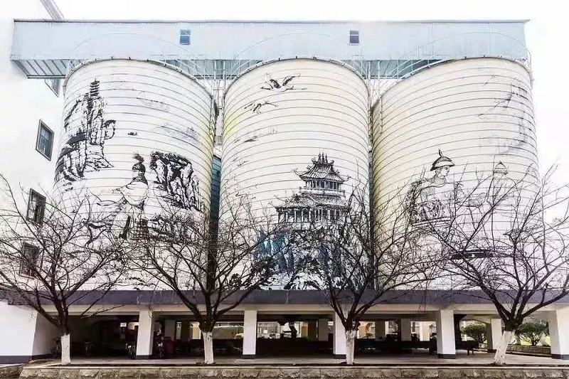 御酒糧倉是黃鶴樓酒業生產用糧的存儲庫,糧倉外部的彩繪分別為《周瑜江夏練兵用酒圖》《黃鶴樓仙酒傳說圖》《張之洞進獻用酒圖》,展示了黃鶴樓酒文化的起源與發展。